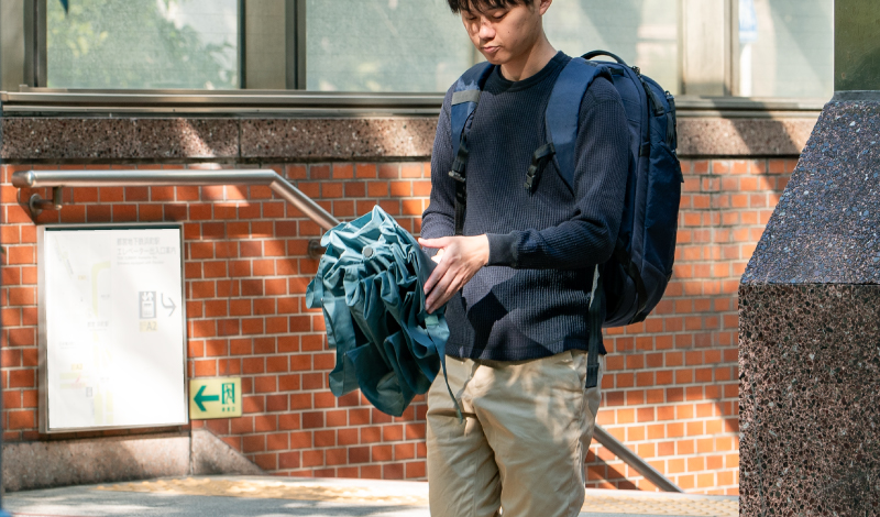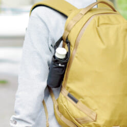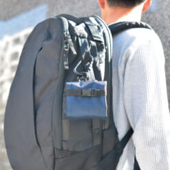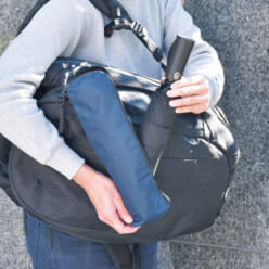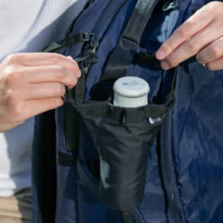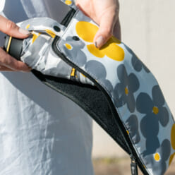 使用していない時は折りたたんで、バックルで止め、ザックやバッグに取り付ければスマートに持ち運びできます。内側はタオル生地になっており、傘に付いた水滴を吸収します。こちらもペットボトルなど結露が気になるアイテムも入れることが可能。