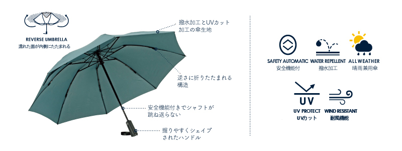 一般的な傘と逆方向に、濡れた部分を内側にしてたためる自動開閉傘。閉じる際に手が濡れにくく、周りが濡れないよう注意するストレスが軽減します。開いたサイズは直径105cmでワイドサイズ、8本骨のため耐久性にも優れた仕様になっています。