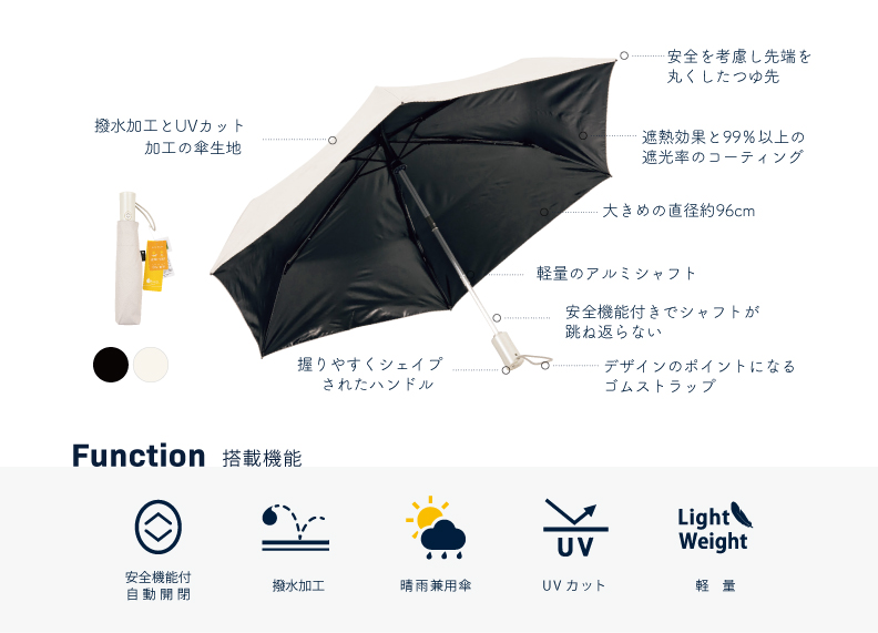 遮光遮熱生地を使用した6本骨の軽量自動開閉傘です。ワンタッチで自動的に傘の開閉ができるので、荷物の多い日や乗り物の乗降時に便利。シャフトをしまっている最中に手を離しても、シャフトが跳ね返らないセーフティ機能付きです。生地に撥水・UVカット加工を施した晴雨兼用傘なので、一年通してお使いいただけます。ユニセックスで気軽に使えるシンプルデザイン。