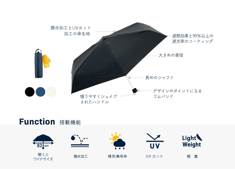 軽量で丈夫なカーボン素材を使用し、約160gと超軽量な遮光遮熱日傘。3段のシャフトでスリムに収納できるため、毎日の携帯に便利です。また、ハンドルの形状をリニューアルしたことで、さらに持ちやすくなりました!年齢性別問わず使いやすい、爽やかなバイカラーデザインが特長です。