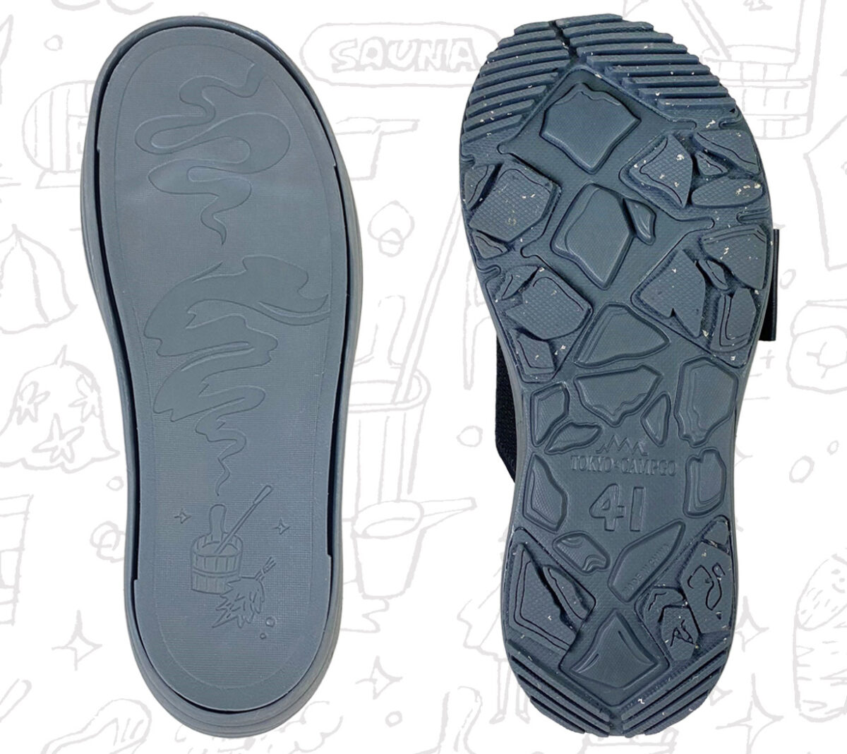 ソール横の流線形は、外気浴の風をイメージしています。フットベッドにはロウリュの湯気、ロウリュ用のバケットと白樺の葉を束ねたウィスクのイラスト。滑り止めの効果も!