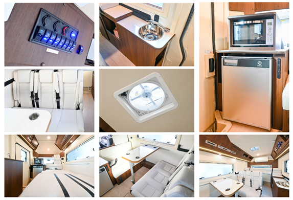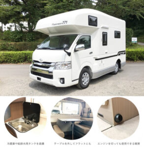 同車両は、パワフルでタフなTOYOTAハイエースをベースに、オリジナルスライドドアにより狭い駐車スペースでも簡単に乗り降りが可能で、独自工法によるスタイリッシュルーフを採用し、従来の室内空間を確保しつつも全高280cm以下を実現しているのが特徴だ。また、家庭用エアコンや大容量の冷蔵庫などキャンピングカーに不可欠なアイテムが全て揃っている。