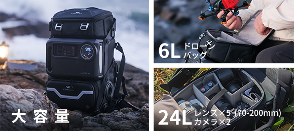 24Lメインパックは、望遠レンズ、短焦点レンズ、デジタル一眼レフカメラなど、あらゆる撮影機材を一度に収納できます。6Lドローンバッグは、高品質の空撮ニーズを満たします。