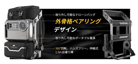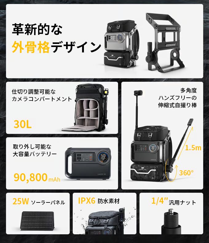 同製品は、バックパック全体の基本フレームとなる外骨格ベアリングデザインを採用しており、身体への負荷を効果的に分散するのが特徴だ。また、取り外し可能な大容量バッテリーや伸縮式の自撮り棒を搭載し、ニーズに合わせたカスタマイズが可能なため、アイデアを無限に広げられるバックパックとなっている。