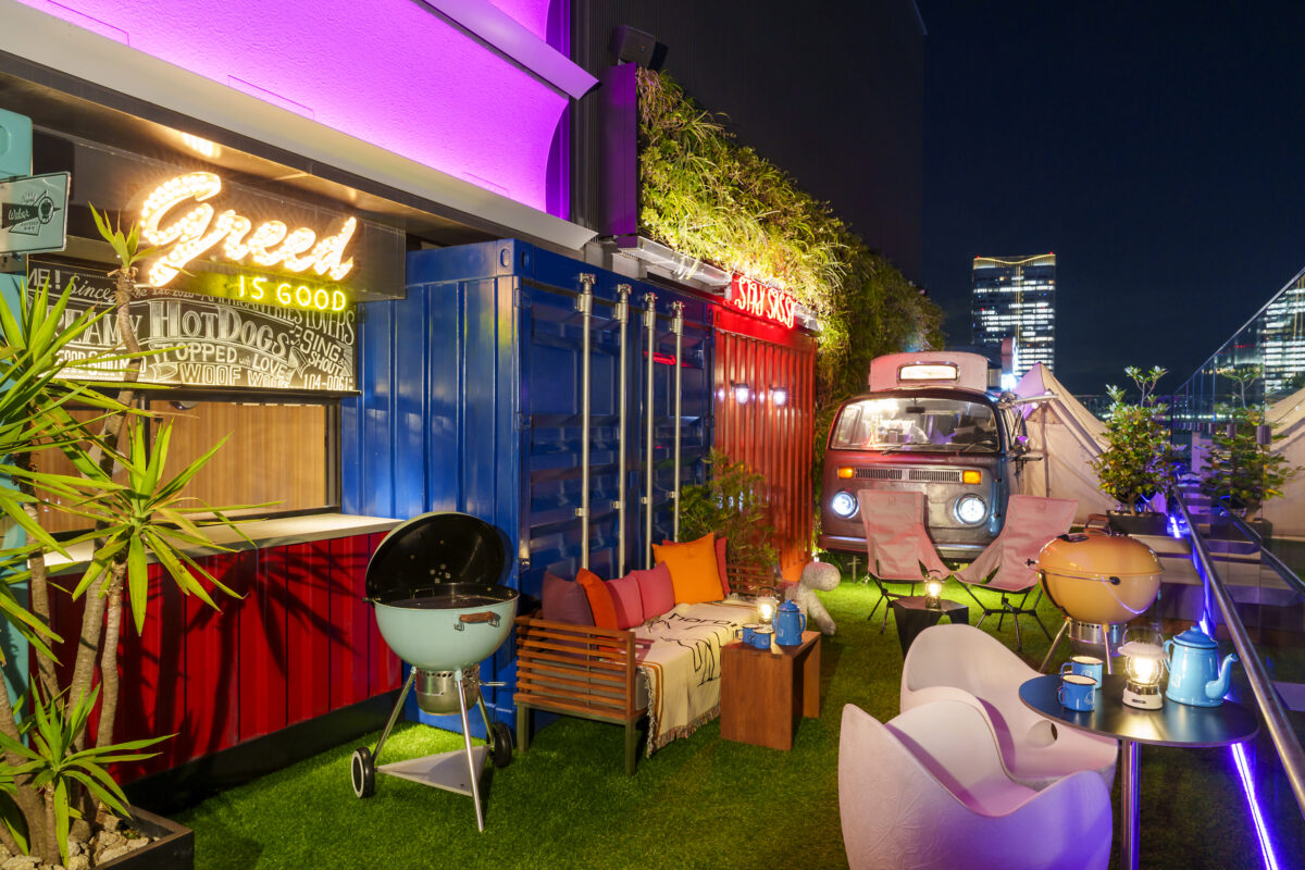 アロフト東京銀座で初の開催となる「Roof Dogs」でのバーベキューガーデンは、『Grilln’ & Chilln’ 』をテーマに、本格的なバーベキューとアウトドアギアで演出された特別な空間でお客様をお迎えします。昼は陽の光を感じながら、芝生エリアにゆったり腰を下ろすのもよし、テントやタープの下で涼むのもよし。夜は爽やかな夜風を感じながら、気分高まる音楽と東銀座夜景で、ご友人やご家族と特別な時間をお過ごしください。