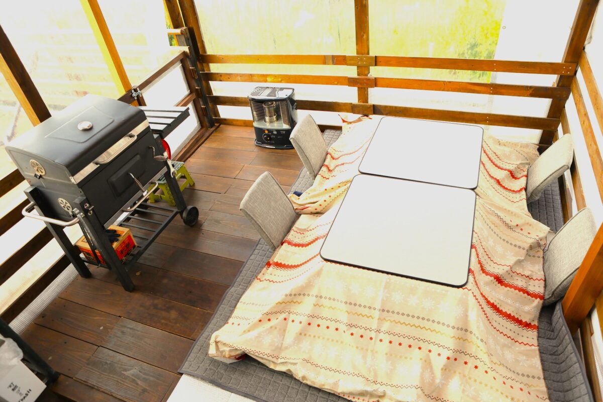 屋根付き全天候型BBQスペースにコタツを設置しております、暖かな時間をお過ごし頂けます