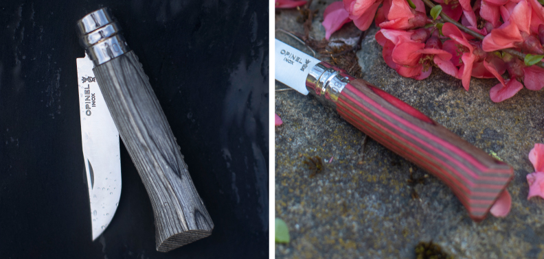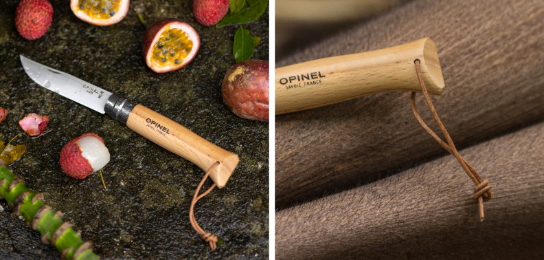 OPINELの定番モデル・ステンレススチールNo.07/08に革紐が付きました。持ち運びにはもちろん、保管の際にも便利です。