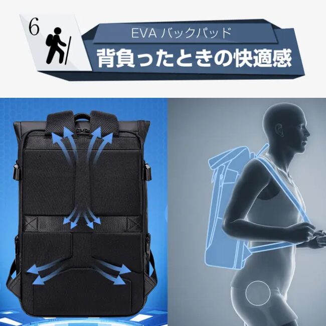 人間工学に基づいた背中の構造:弾性とクッション性に優れた EVA バックパッド+エアガイドグルーブ運動時の衝撃を吸収し、身体と中のアイテムを守ります。背中にフィットしていても、通気性があるのでオールシーズン使用できます。