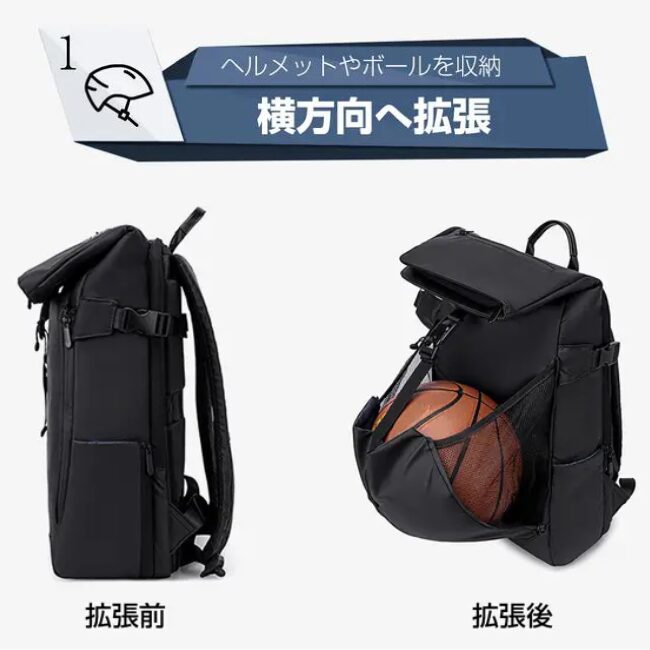 横の拡張は外側の大きなネット式拡張で、ボールやヘルメットのような大きいものを収納。縦の拡張はロールトップ式に拡張でテニスやバドミントンのラケットのような長いものを収納できます。