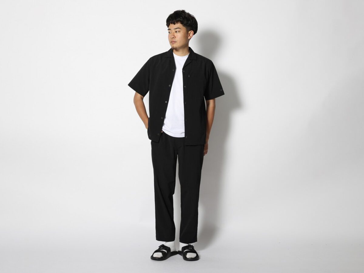 こちらは素材の機能面を最大限に活かした、軽い着心地のオープンカラーシャツ。ディテールを控えめにしたシンプなルデザインで、使いやすく、自由なスタイリングを楽しむことができます。前立ては着脱がしやすいドットボタン仕様で、胸もとには中身の落下を防ぐファスナー付きポケットを配置。ラフなショーツを合わせて夏らしく仕上げたり、女性はワンピースに上にさらりと羽織ることもおすすめです。