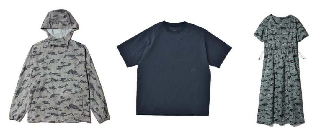 アノラック、パンツ、シャツ、ウィメンズ用のドレスなどのウェアのほか、キャップやハットといった小物まで幅広くラインナップ。また、シンプルな無地タイプに加え、カモフラージュ柄のプリントデザインタイプも用意しました。カラーは無地タイプでブラックとネイビー、プリントデザインタイプでカーキとグレーを展開します。
