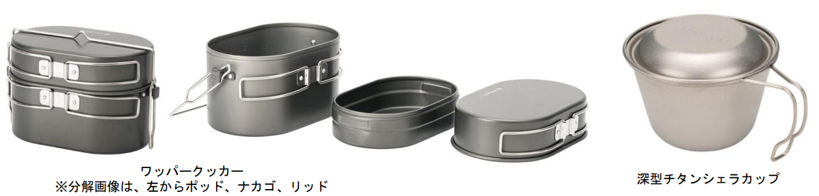 「ワッパークッカー」は、「曲げわっぱ」をモチーフにしたソロ・デュオキャンパーにおすすめのアルミクッカーとなり、本体のアルミニウムの表面には硬質アルマイトを施しているため耐摩耗性に優れている。「深型チタンシェラカップ」は、従来のチタンシェラカップの深さと容量をアレンジしたほかスープなどの汁物に適した仕様にアップデートしているのが特徴だ。