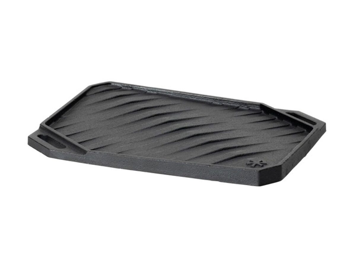 鋳鉄製であるため蓄熱性が高く、焼肉やステーキなどの調理に使用することが可能。底面にはバーナーのゴトクが収まる溝を備え、グリドルの滑落を防止。 また、対角線上に山なり形状になっているため、食材から出てくる余分な油分をグリドルの端に流します。付属のステンレス製ハンドルを対角線上にある穴に差し込むことで、持ち上げることができます。