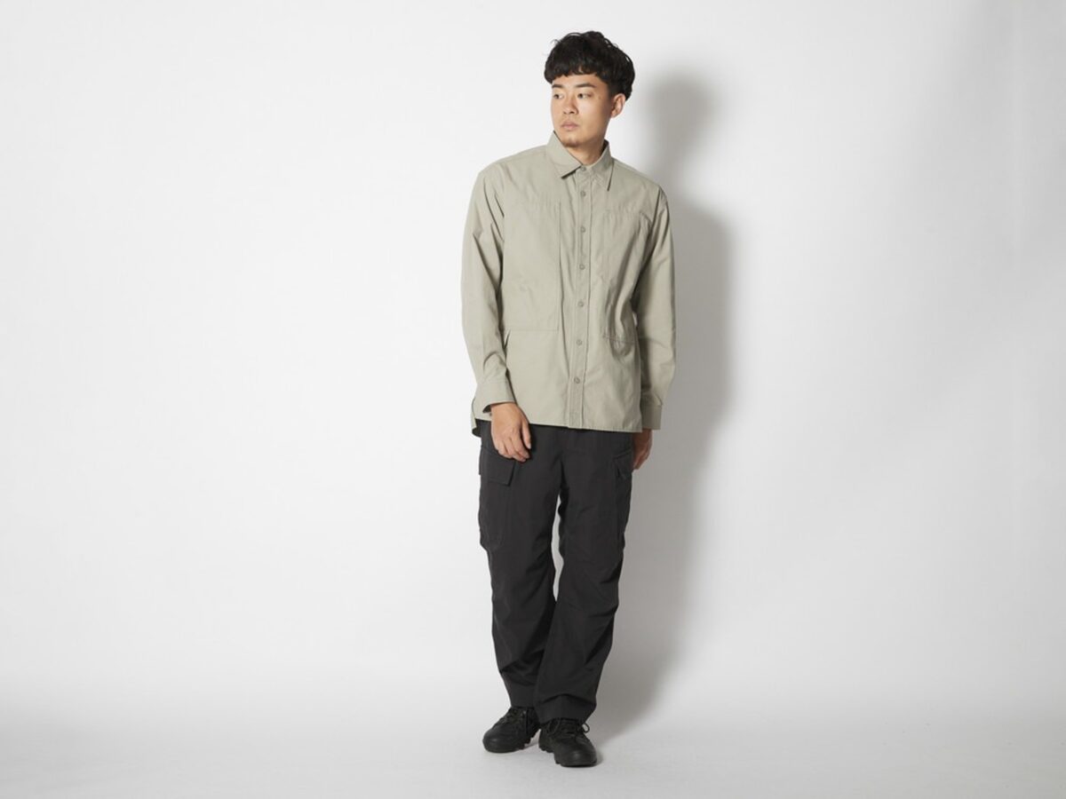 ミリタリーライクな雰囲気を活かした長袖シャツ。後ろ身頃の左右タックで肩まわりと身幅の運動性を確保し、両脇裾にはスリットを入れて、より動きやすく仕上げています。