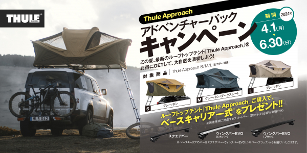 同キャンペーンは、ルーフトップテント「Thule Approach」を購入すると、ベースキャリア一式がもらえるお得なキャンペーンとなる。キャンペーン期間は2024年6月30日まで。ルーフトップテントを検討している人はこの機会を活用してみていかがだろうか。