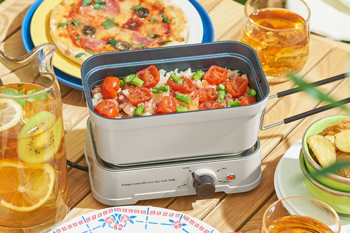 炊飯だけでなく、焼く・煮る・蒸すなどの調理ができ、『万能クッカー』と言われる“メスティン”。「Toffy ホットメスティン」は、そんなアウトドアで人気のメスティン調理がおうちで楽しめるキッチン家電です。メスティンに専用加熱台が付属し、火を使わずに食卓でも安心して調理できます。無段階の火力調節機能付きで、キャンプ調理では難しい火加減の細かな調節もお手のもの。とろ火でじっくり煮込んだり、火力を強くして炒め物など、どんなレシピも自由自在。お皿いらずでそのまま直接食べられて、余分な洗い物なしに、気軽に調理&食事ができるのも嬉しいポイントです。専用メスティンは直火でも使用できるので、おうちとアウトドア両方で楽しめます。内部はふっ素塗装でお手入れもラクラクです。ひとりご飯にも、みんなが集まるパーティーシーンでも大活躍!