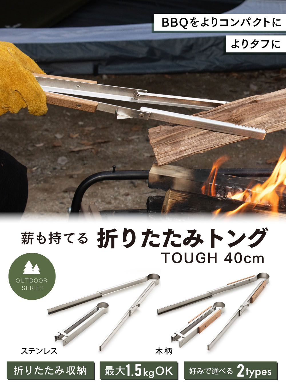 ギザギザ刃先で掴んだものを離さない。バーベキューの時の食材はもちろん、焚火時の薪もしっかりと掴めます。使用時の全長は40cmあるためコンパクトながらも使いやすいサイズ感になっております。