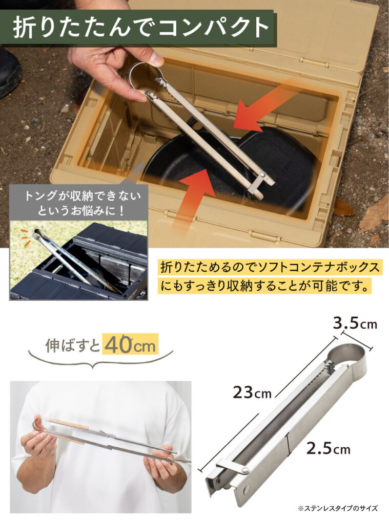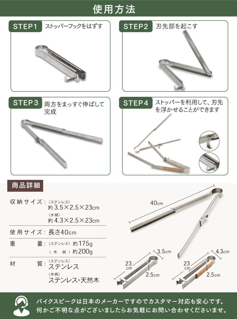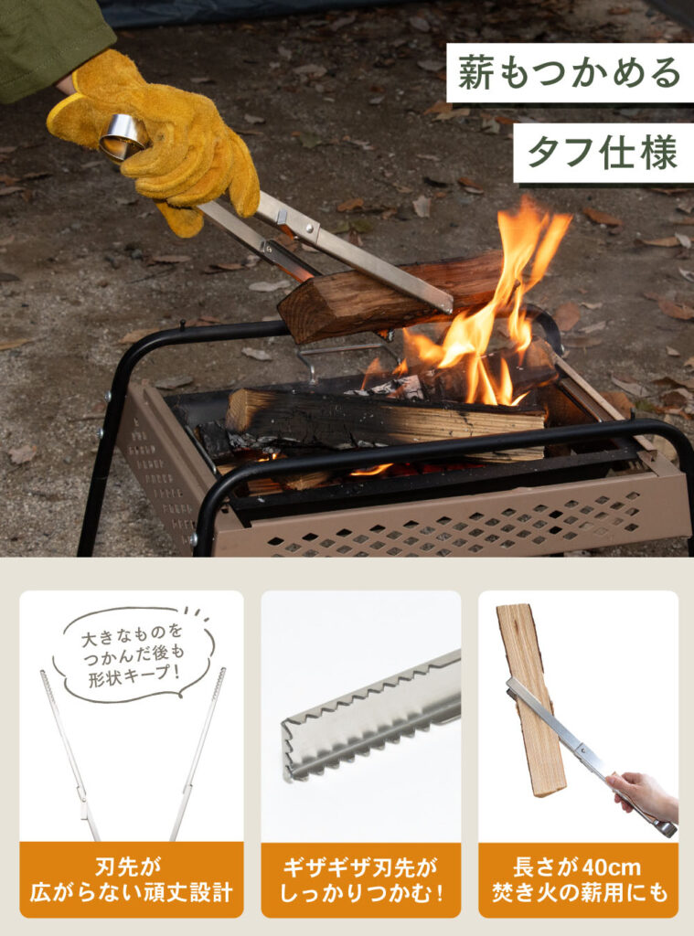 伸ばした時の全長が40cmあるため、食材を掴んだり焚き火の薪を掴んだりするのに適切な距離で熱くない。