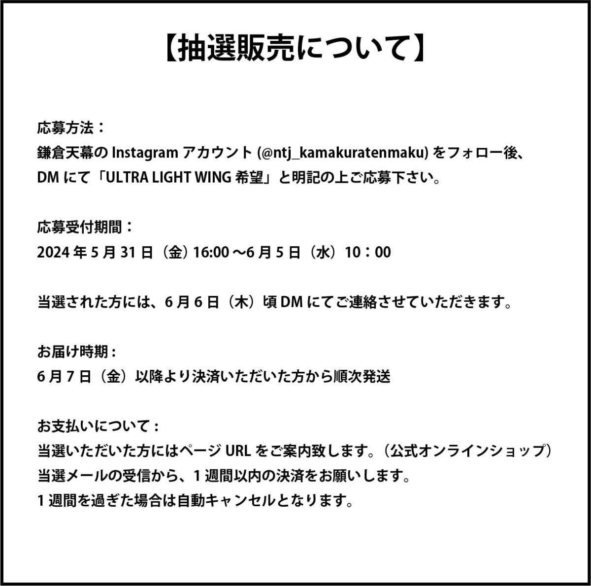 株式会社ニューテックジャパンは、5/31(金)16時より本物志向のオリジナルブランド “鎌倉天幕” の新商品、「ULTRA LIGHT WING(ウルトラライトウィング)」の抽選販売を開始します。