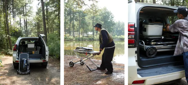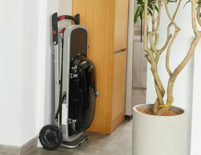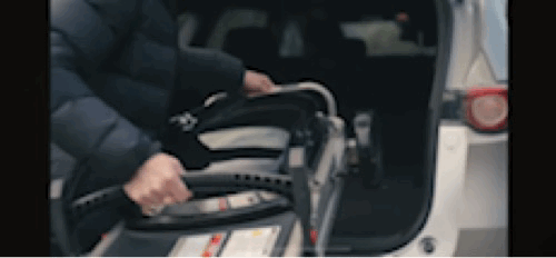 車に積むときは、ハンドルを立てて持ちやすいようにできます。本体を折りたたんだ状態で、旅行用トランクケースのように引きながら移動させることができます。