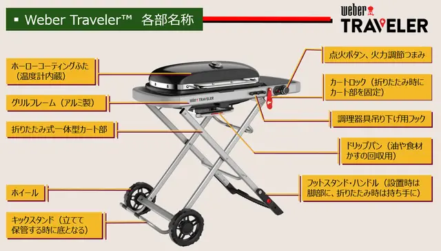※Weber Japanが取り扱うWeber Travelerのガスグリルは、日本のガスの仕様に合わせて設計された製品です。日本国内で販売する際に求められる技術要件に適合しています。米国や他国で販売されているWeber Travelerとは、燃料の流路に使用されている部品が異なっているため、日本国内での安全な動作は保証できませんので並行輸入品などご注意ください。