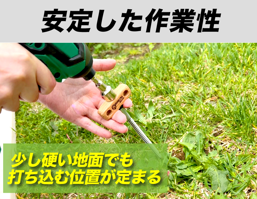 手で押さえながら打ち込むことができるので、少し硬い地面でも、打ち込む位置をしっかり定めて安定してボルトを打ち込むことができます。