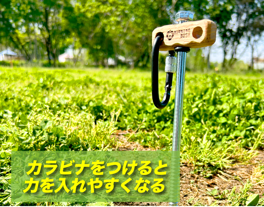 力の弱い女性やお子さんの場合、市販のカラビナなどをつけると力を入れやすくなるので、さらに安定して打ち込むことができます。