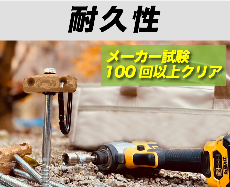 一般的なペグは、ハンマーで叩いて打ち込むので、ペグが曲がると再使用出来ません。ペグは消耗品だと考えている人も多いのではないでしょうか。しかしイージードリルペグは、9Φのボルトが回転しながら地中に刺さっていくので、曲がりづらくて非消耗品に近いです。メーカー試験では、100回以上使用しても問題無く使用可能でした。