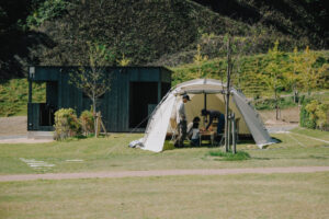 中央の芝生スペースを囲むようにオートキャンプサイト、キャビン、センター棟が位置しています。宿泊エリアより車で5分の場所に自然アクティビティの活動拠点 山座熊川Outdoors Baseがあります。
