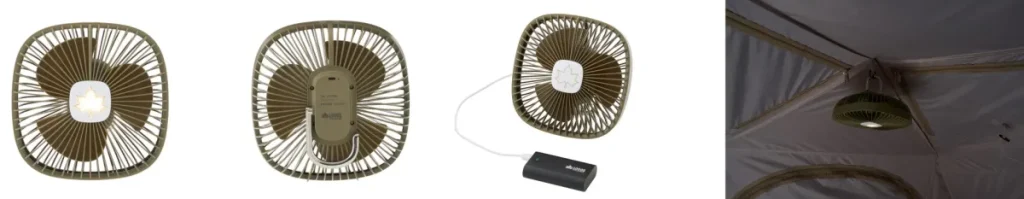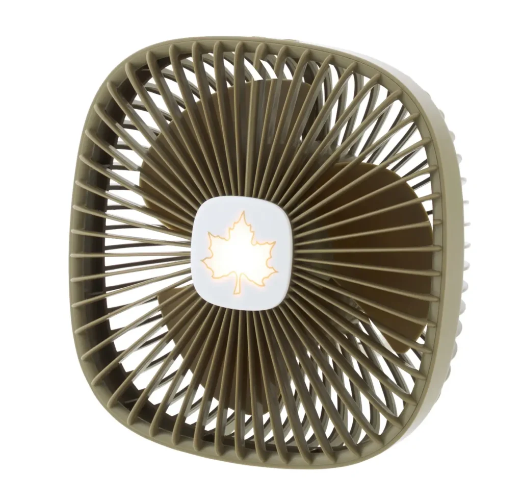 460gと超軽量で、吊り・置きの2WAYで使えるハンギングフックが付いたアースカラーの蓄電式扇風機。使用時は正面中央のメイプルリーフ部分が光る仕様で、暗やみでも扇風機の位置が分かりやすく安全。USBポートから蓄電できるので、アウトドアシーンで活躍。