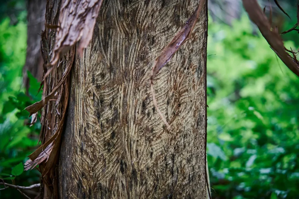 くまはぎとは、熊が水分を舐めるために木の皮を剥ぐ行為をいいます。