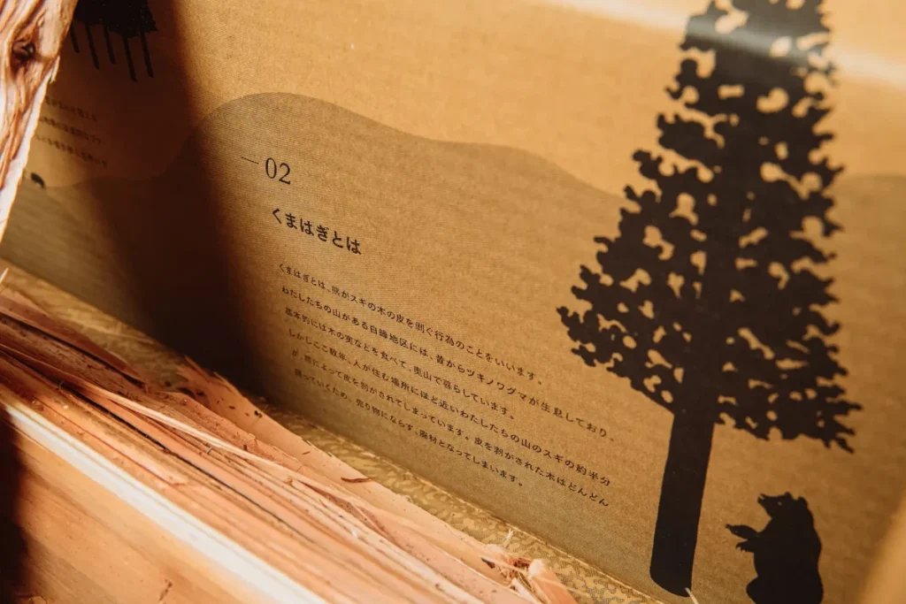 くまはぎの薪の箱はアースカラーを基調とし、昨今のキャンプサイトに馴染むおしゃれなデザインを目指しました。箱の内側にはくまはぎ被害や里山整備の重要さをイラストで解説し、開封体験を楽しみながら森の問題を学ぶことができます。