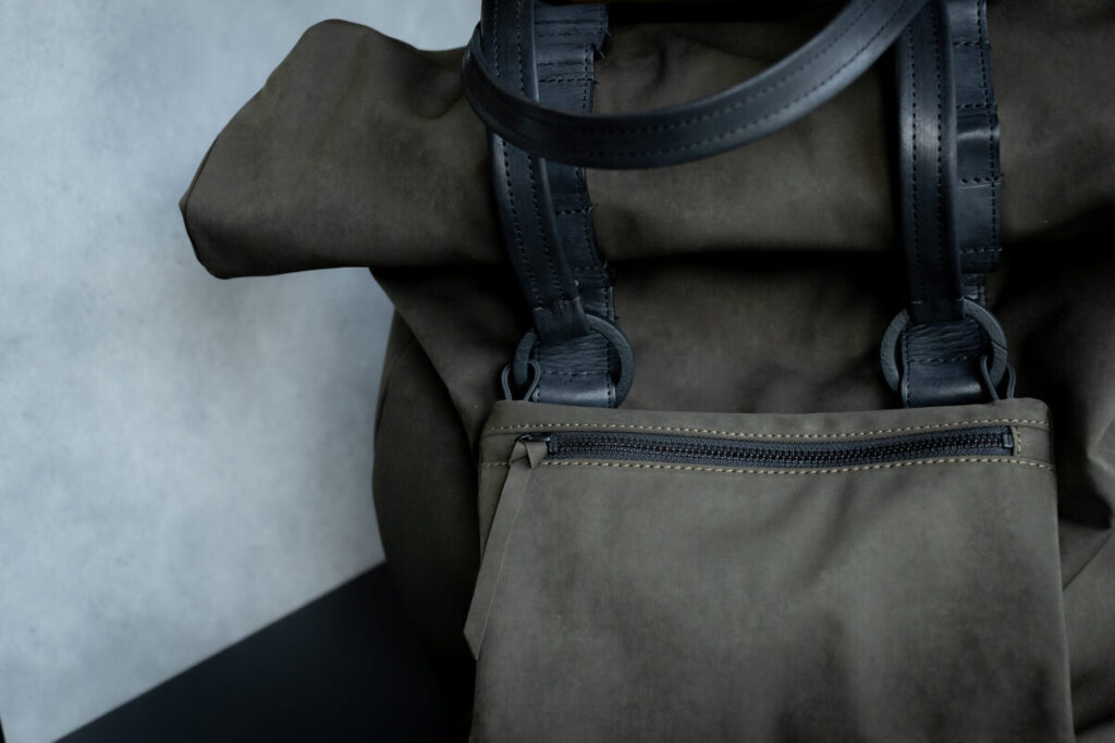 • ロールトップの難点である、内部アクセスを専用ポーチを付属する事で解決する。スマホ、財布等の使用頻度の高い荷物も収まる容量。別売りのショルダーストラップでサコッシュとしても使用可能です。