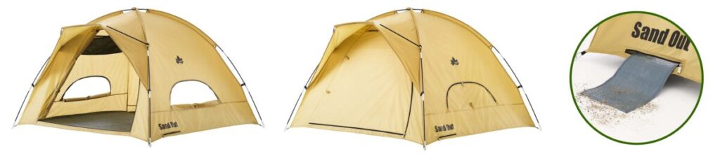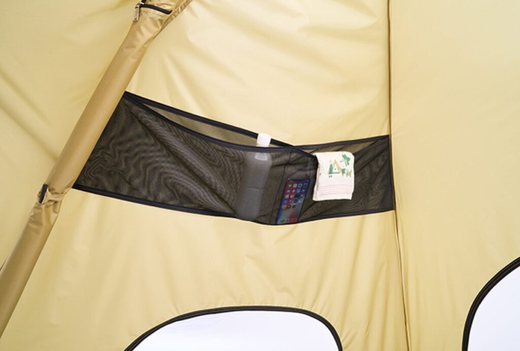 LOGOS独自の「SUND OUT SYSTEM」搭載で、室内に砂が入ってしまっても本体下部にあるファスナーを開けると砂を簡単に外に出すことができるので、撤収前にお掃除する時間を短縮できます。室内には小物の収納に便利なメッシュポケットがあり、スマートフォンなどを置いておくのに便利なほか、ポケットのメッシュ生地自体にタオルなどを掛けると、ハンガーとして使うこともできます。