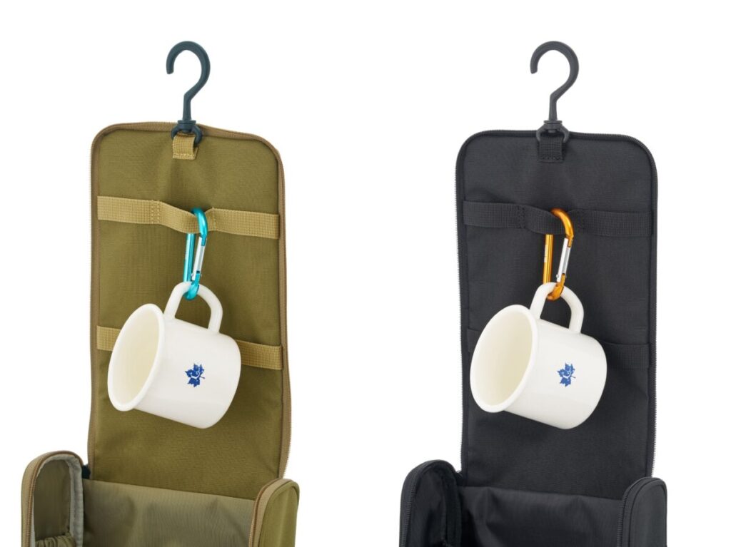 同製品は、フタ部分の裏側に上下段の2本のベルトが付いていて、カラビナを付けてシェラカップを吊るしたり、内部にはポケットが3ケ所あるため整理整頓して小物が散らばるのを防いだりと、シーンに応じた使い方ができるのが特徴となる。吊るすことで省スペースな保管を実現するほか、細々としたツールの収納に便利だ。サンドとブラックの2色展開で、価格は3,410円(税込)。
