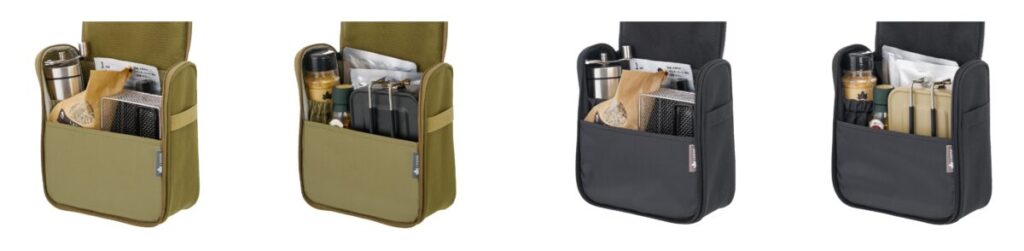 コンパクトでありながら、マチの幅が広いので、ホットサンドパンとメスキットとコーヒーミルがすべて同時に収まるほどの収納力。また、コーヒーを楽しむためのセットも一式収納可能。調味料などの持ち運びや保管にも便利で、ソロキャンプに必要な細々したツールの収納にもおすすめ。