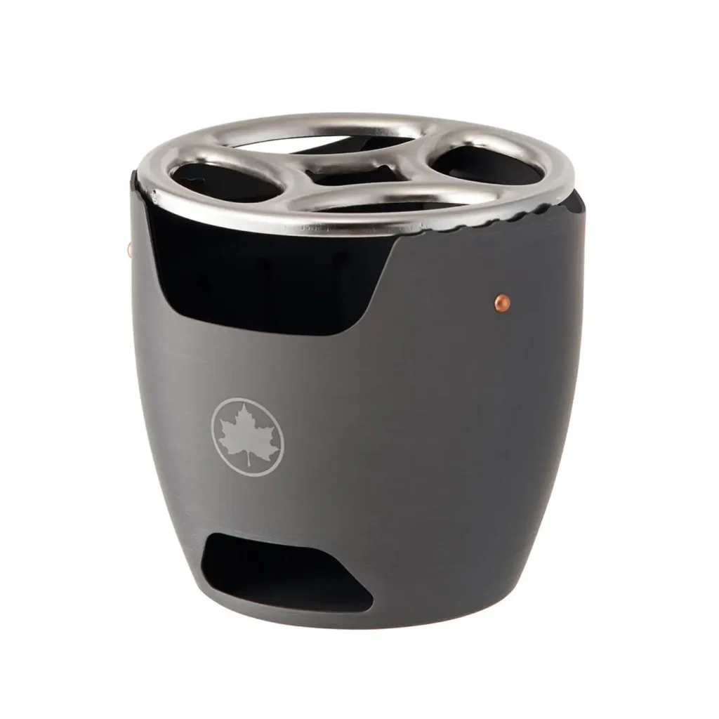 LOGOSのメープルリーフのロゴが入った、使い込むほどに味が出る真鍮製のアルコールバーナー。燃焼音が静かなので、深夜でも周囲を気にせず使用できる。アウトドアシーンはもちろん、防災用品としても使える。