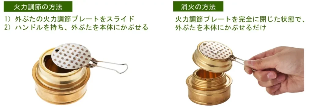 使用時には、別売りのアルコール燃料を注ぎ、ライターなどで着火するだけですぐに使用できるので、準備に時間がかかりません。火力調節の際は、外ぶたの火力調節プレートをスライドさせ、ハンドルを持って外ぶたを本体にかぶせると簡単に調節でき、火を消す時は火力調節プレートを完全に閉じた状態で外ぶたを本体にかぶせるだけで消火できます。本体にはアルコール揮散穴があり、アルコールがより早く気化して、ムラのない均一な炎が燃え上がります。