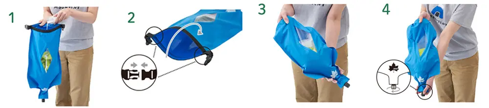 2)水を入れ、上部の口を閉じ、矢印方向にクルクルと巻き(4回以上)、バックルを留めて密閉します。