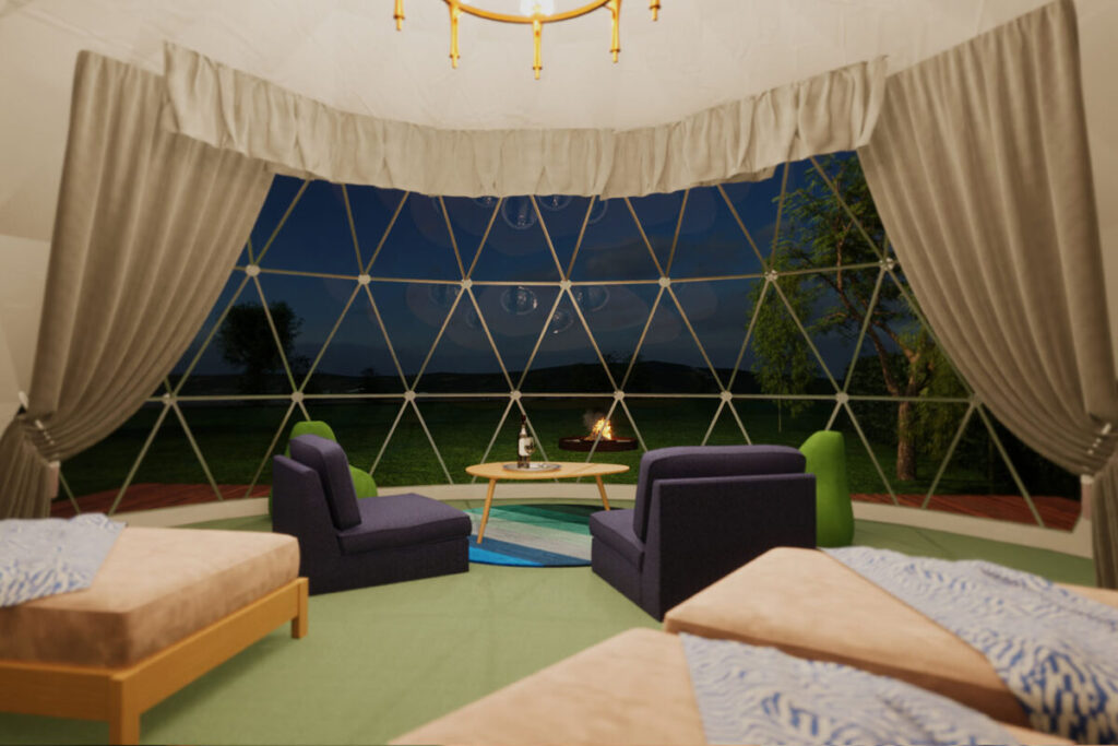 共有スペースにはすべての面がクリアになった透明ドームテントを配置。