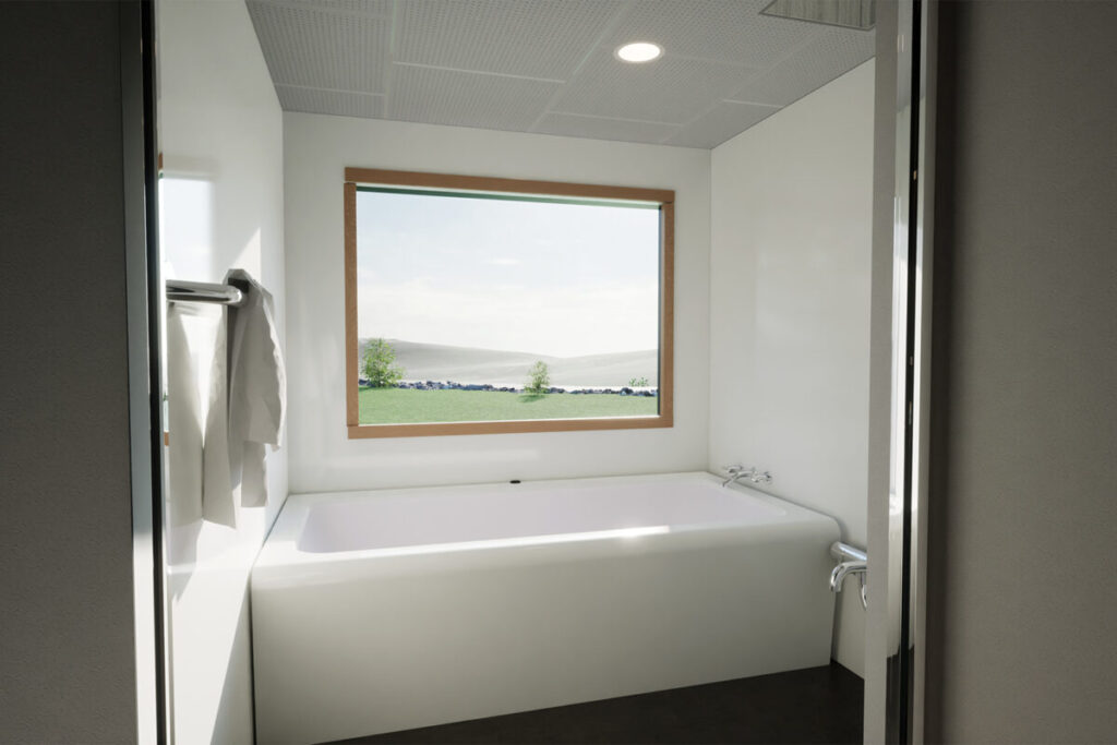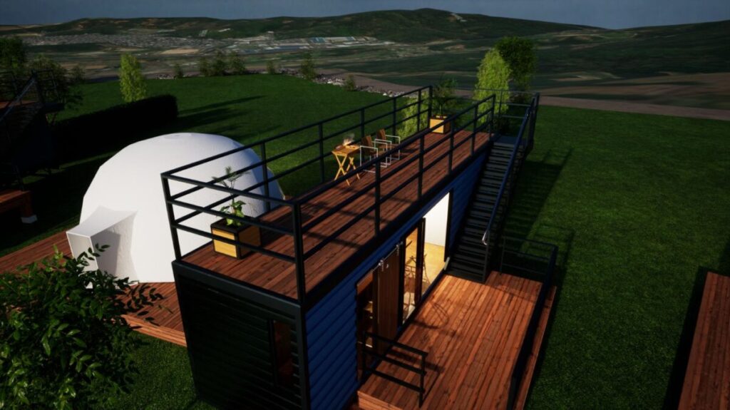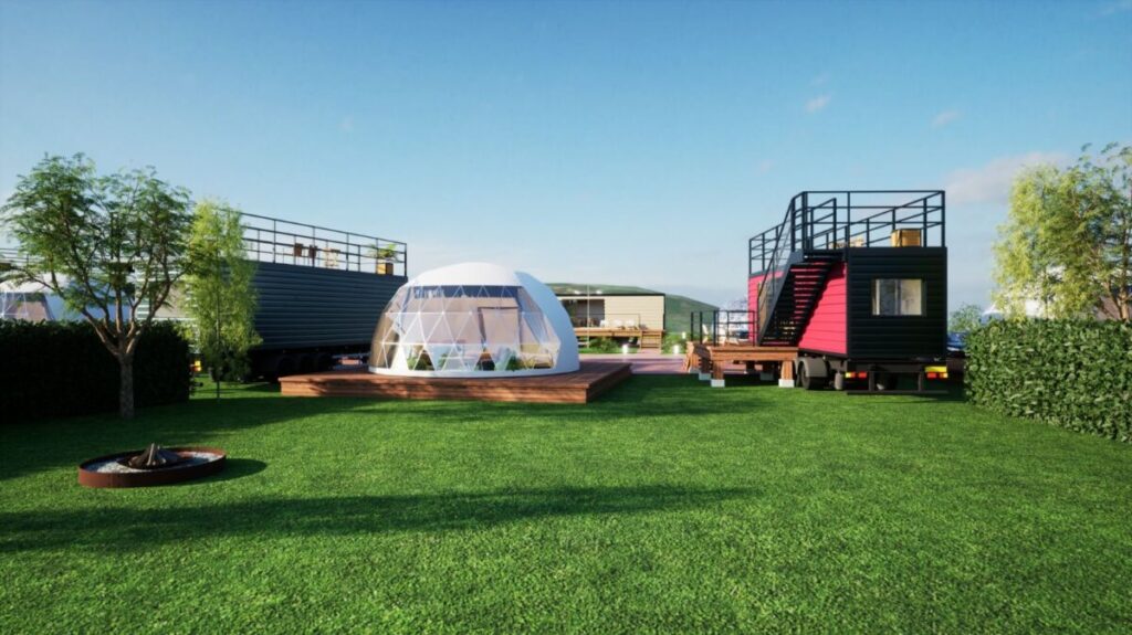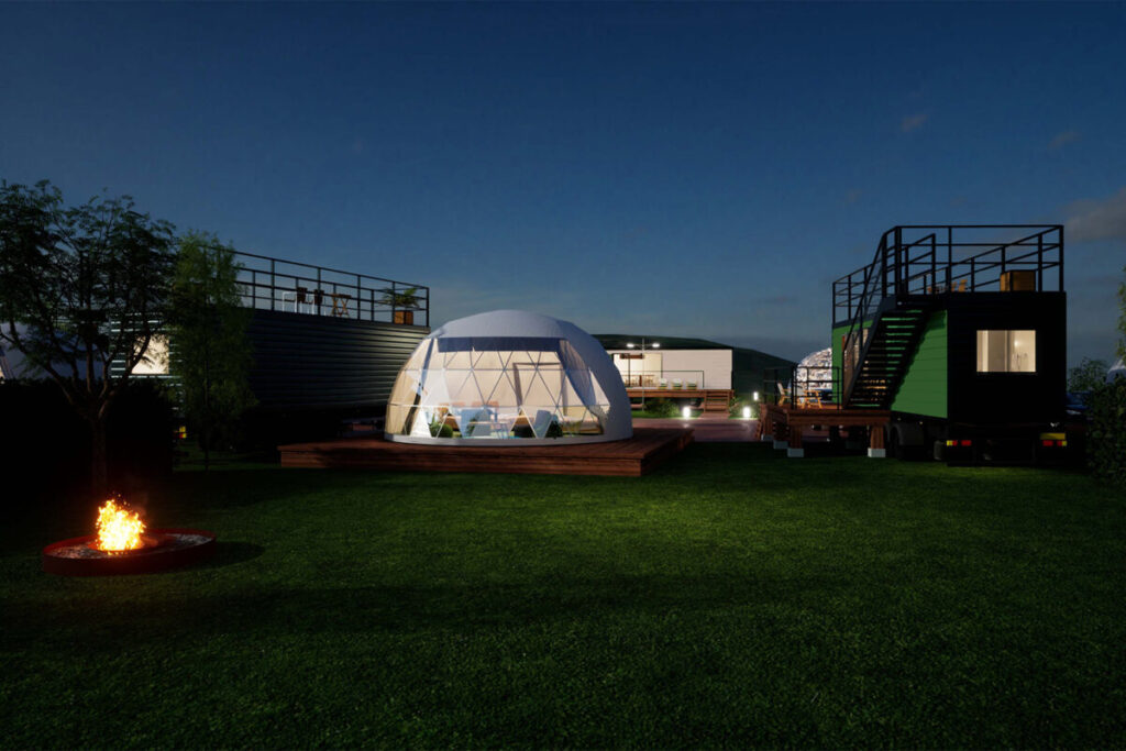 広大な敷地に5棟というプライベート空間をしっかり確保した配置。全ての棟がドームテント+トレーラーハウス+250㎡以上のプライベートガーデンを備え、快適な食事スペース、個別の焚き火台や浴室、トイレを完備しています。トレーラーハウスは屋上にあがることができ、大自然の山々を望む開放的な眺望、夜には視界いっぱいの