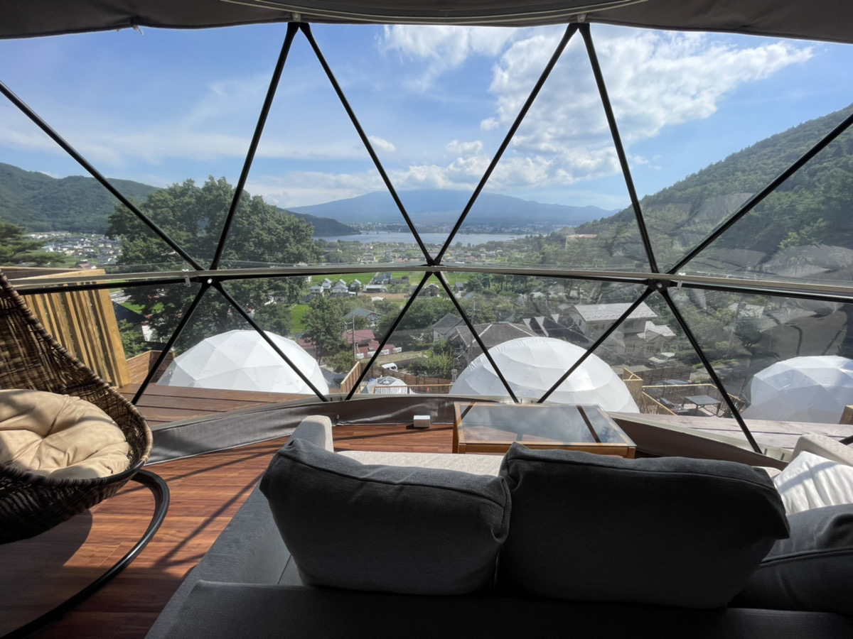 地域の再活性化を図るため2022年8月10日に富士河口湖町にオープンしたグランピング施設 嶺乃華は、都心からわずか90分の場所にあり、富士山を正面に臨むドームテントで、昼も夜も富士山と河口湖の絶景を存分に楽しむことができます。