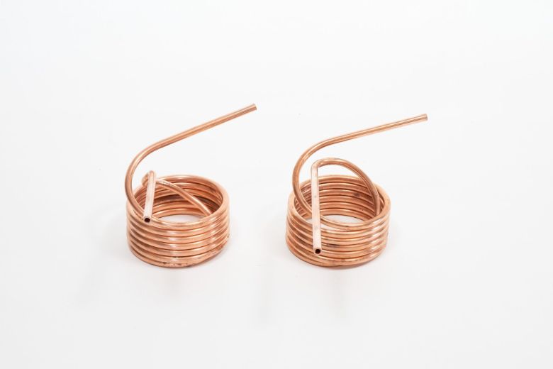 今回販売する「てんぐの小風呂」は、銅管をコイル状に成型した熱交換器2個、または3個とそれらを繋ぐ異径ソケットのセットである。これに普段キャンプで使用する鍋やコンロ、風呂ポンプを組み合わせるだけで容易に追炊きと保温ができ、いつでもどこでも気軽に入浴が可能になる。