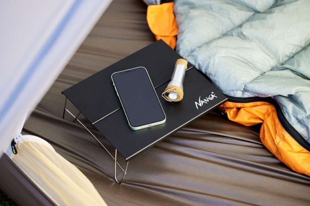 テント内でのシュラフサイドテーブルとしても大活躍。スマホや読みかけの本、ドリンクを置くのに便利です。