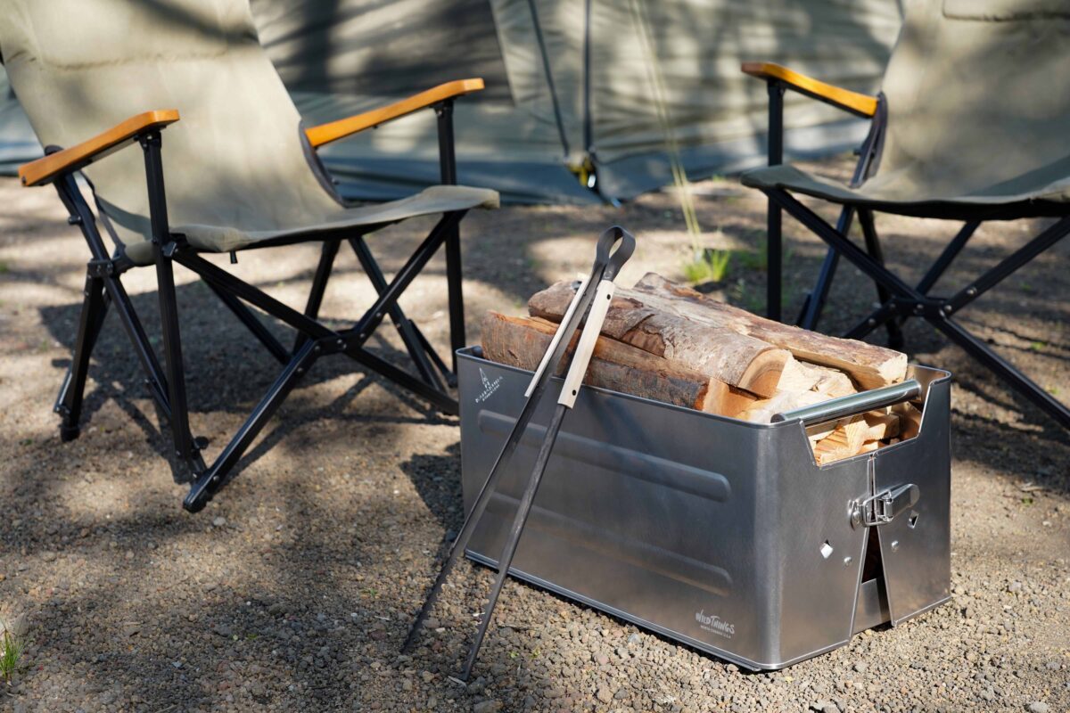 重くかさばる薪を収納・保管し、持ち運びのできるコンテナから、焚火台へ早変わり。