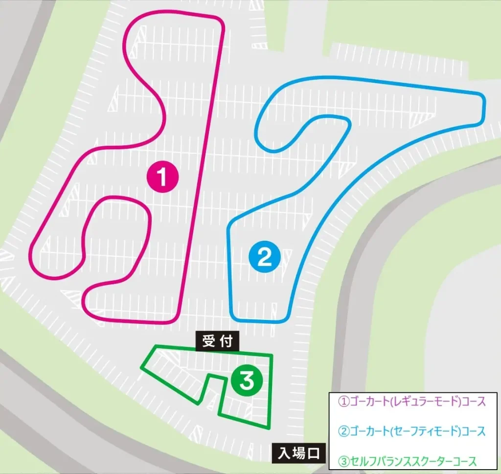 コ ー ス :コース全長約500mコースでは、アクセル全開で楽しめるストレートやメリハリのあるコーナリングでドライビングが楽しめます。