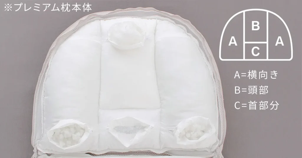 中央下部(C)は「柔らかすぎず、潰れに強い」ポリエチレンパイプを詰め、後頭部から頸部をしっかり支えて安定させます。
