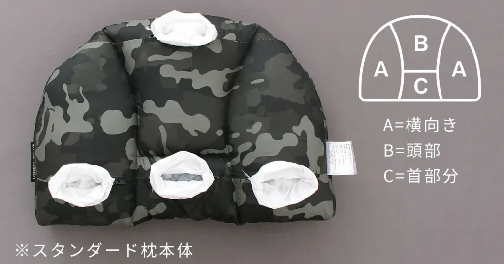 キャンプまくらは、じぶんまくらのノウハウに基づいた「4つの独立ポケット」構造で、ポケットごとに中身の詰め物を取り出せるファスナーが付いており、詰め物を増減して高さ調整ができます。
