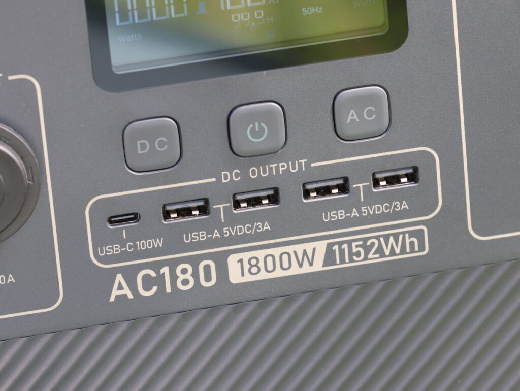 ブルーティAC180は、安全かつ耐久性の高いリン酸鉄リチウムイオンバッテリー(LiFePO4)のポータブル電源。交流のAC出力は、いわゆる100Vのコンセントが4つ。直流のDC出力には12V/10Aのアクセサリーソケット、5V3AのUSBタイプAが4つ、USBタイプCに加え、非接触型の充電ポートと、スマートフォンからPD機器、パソコンまで色々なものが充電できるようになっている。