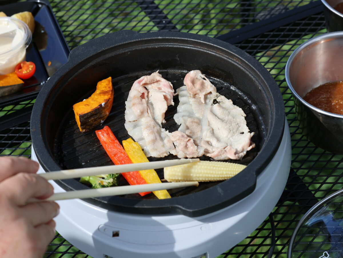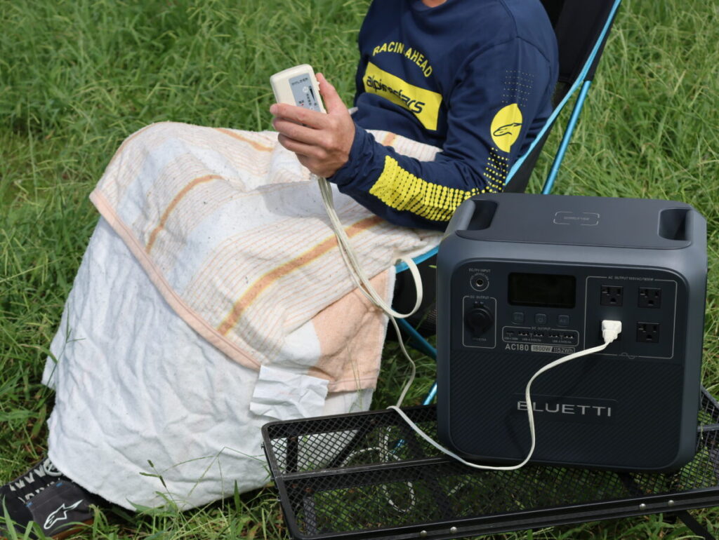 また現場では、より実際の使用環境を再現するため100%の状態からまず電気ケトルでコーヒーを淹れ、その後にホットプレートでBBQと鍋を作り1時間ほどの食事をしてみるとブルーティAC180の残量は28%まで減っていた。その後、電気毛布を繋げてみると5時間ほど使えるという表示が出ていた。つまりブルーティAC180があればひととおりの食事ができて食後には電気毛布も使えてしまうというわけだ。
